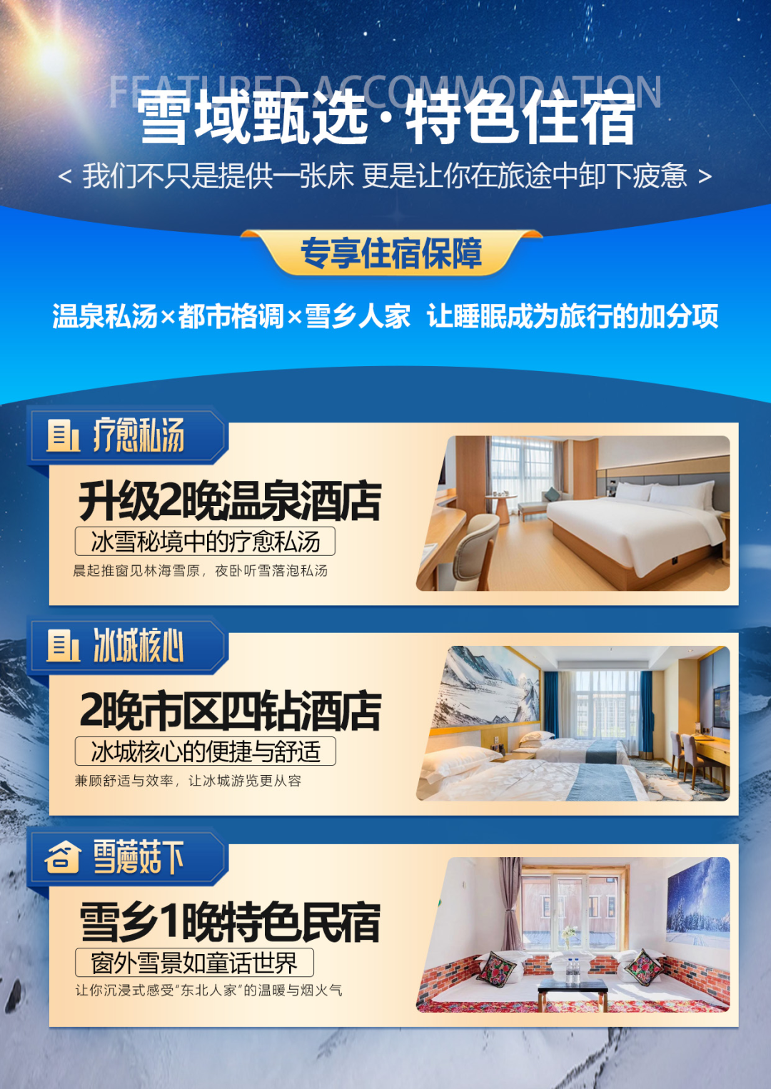 ❄甄选酒店:升级2晚温泉酒店+2晚市区四钻酒店+1晚雪乡主景区内民宿,拒绝景区门口擦边用房,保证徒步5分钟内到雪韵大街,不偏僻,不擦边、更舒适+延吉1晚3钻酒店